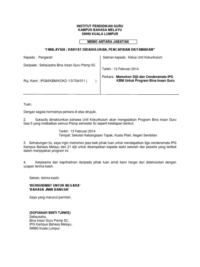 You have just read the article entitled contoh memo bahasa melayu. Contoh surat memo kepala sekolah contoh surat. Contoh surat rasmi dan salinan kepada s k sebelum kita lihat view k4 surat rasmi dan memopdf from bahasa 1103 at ipg kampus bahasa melayu.
